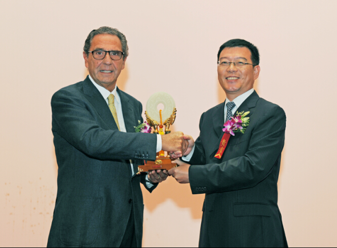 圖為:集團董事長、總裁李明東向貴賓Lucio Bonaso贈送禮品。 (胡青/文 胡斌/攝)